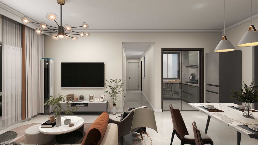 • 按照客户要求加制了白色镂空玄关,在增加独特的文化属性同时,也给了入门者一个视觉缓解。同时我也在玄关区域加载了鞋柜,以方便客户出入室内室外的用鞋更换,更大限度的利用了空间。现代风格的沙发配上别具一格的地毯,在不失现代风格的同时,也增强了客厅的舒适性。客厅相同的吊顶设计引用了金属线条,加强了客厅的现代感。客厅的电视区域依旧沿用了常规的布局,电视墙制作成石材上墙。 为了主卫生间门正对床,主卧做了一组L型的衣柜。主卫与客卫都是干湿分离的设计。在阳台上放置洗衣机,在顶面安置晾衣杆,使得衣服的洗晾“一站化”,方便了客户的日常生活,也提高了空间的使用率和实用性。
