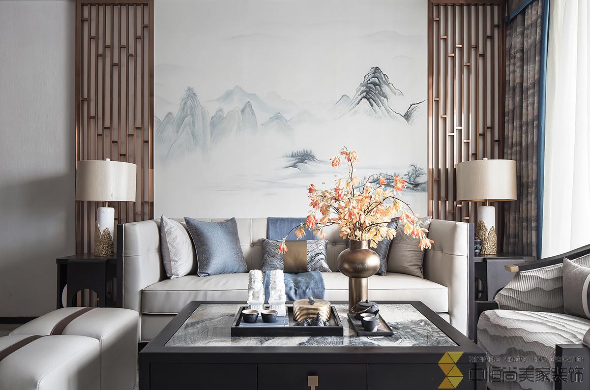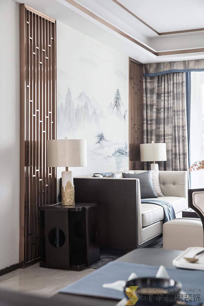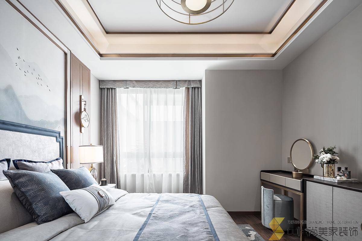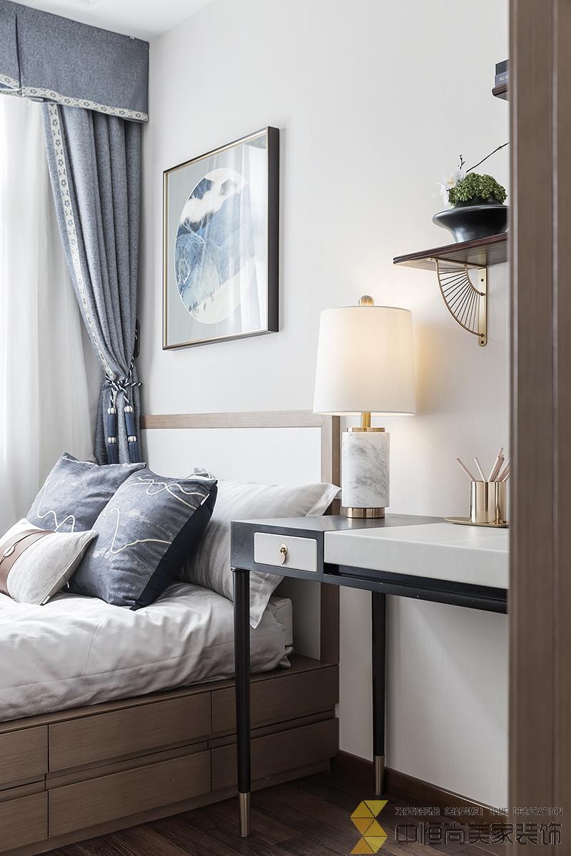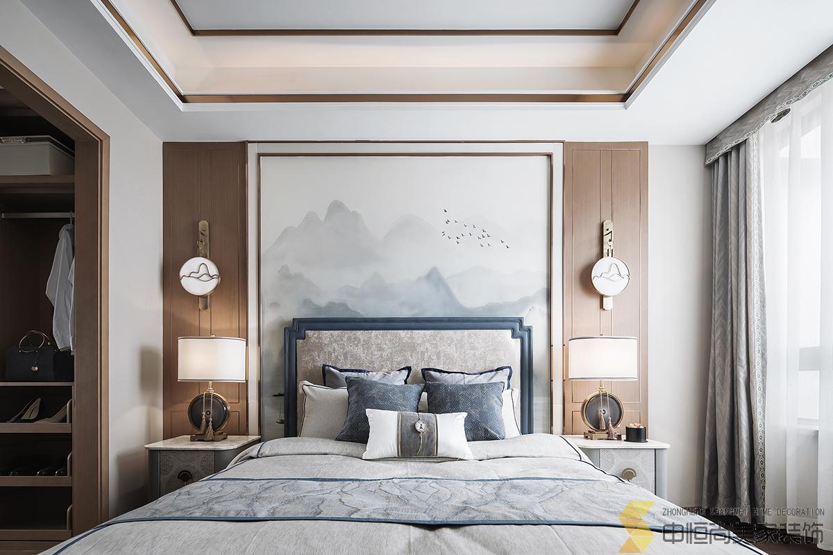 • 室内主色调汲取了江南水乡高级烟灰蓝,在空间中铺陈出别有风致的现代中式美学,处处透露着对东方清雅生活意境的美好追求。整个空间中,没有任何显著的东方符号堆砌,言有尽,意无声,却自始至终浸透着东方特有的禅思静谧。 素雅的米灰色平静而柔和,温暖的琥珀色、深邃的烟灰蓝与木色搭配相得益彰,坐榻端正清秀,山水峻秀,云之缥缈。隐约的水墨背景与两侧的金属屏风,构成虚与实,疏与密的哲学均衡美,茶几大理石的纹路自然演绎了一幅自然山水之美,赋予空间绵绵不尽的诗意想象。 卧室的设计中,色彩的运用清幽淡雅,沉静的灰蓝调和趋近自然的木色是空间的主调,丝质与棉麻床品深具质感,水墨背景造型、瓷器台灯、花卉等各类小品摆设其中,相映成趣,空间气质盈盈。