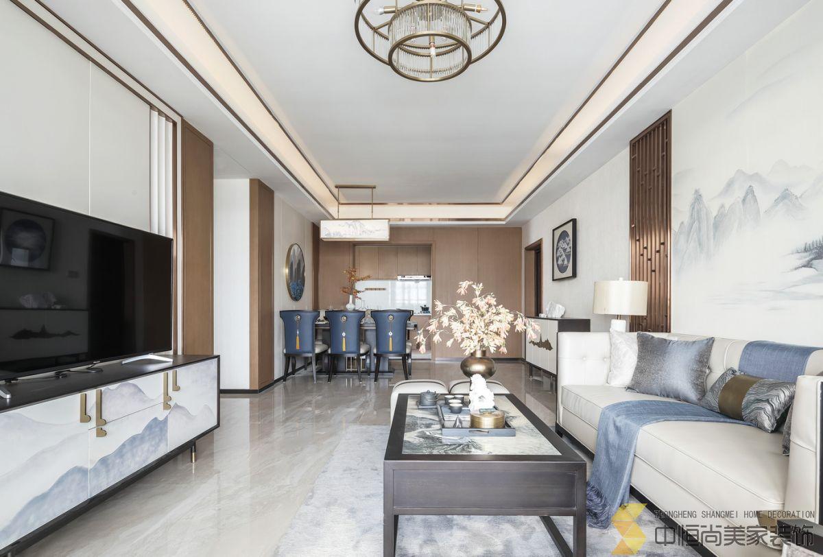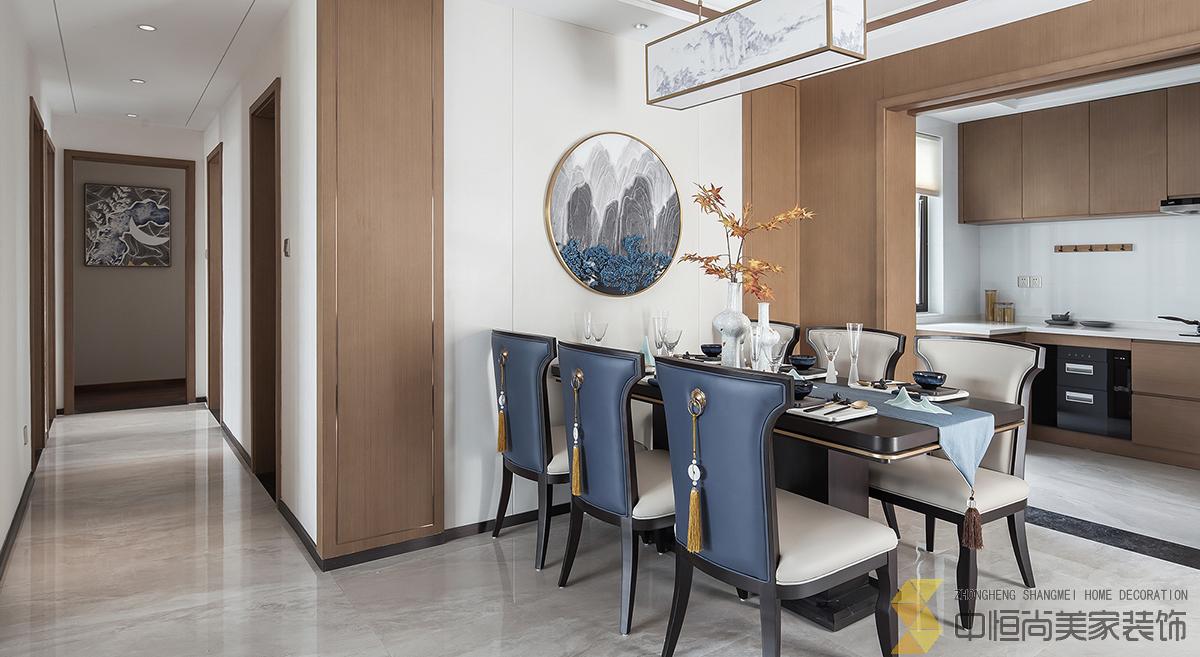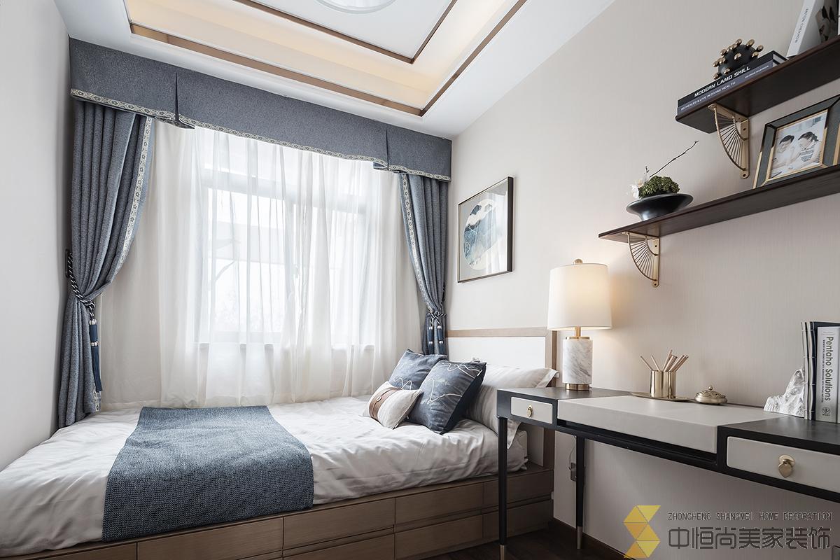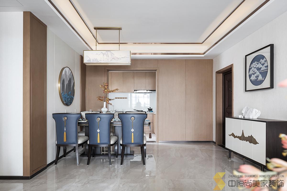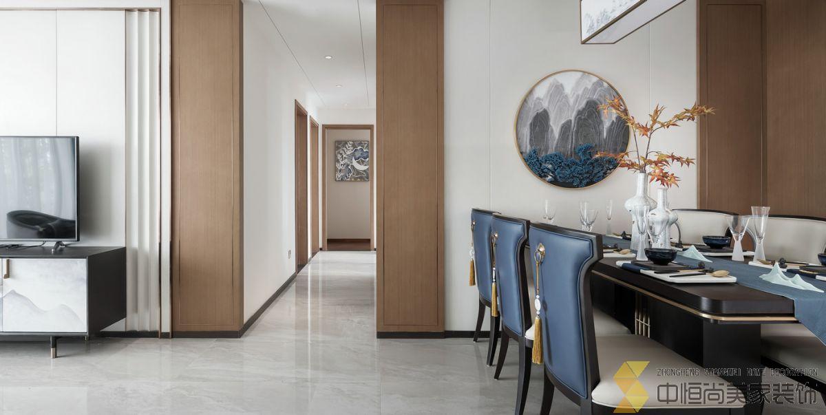 • 室内主色调汲取了江南水乡高级烟灰蓝,在空间中铺陈出别有风致的现代中式美学,处处透露着对东方清雅生活意境的美好追求。整个空间中,没有任何显著的东方符号堆砌,言有尽,意无声,却自始至终浸透着东方特有的禅思静谧。 素雅的米灰色平静而柔和,温暖的琥珀色、深邃的烟灰蓝与木色搭配相得益彰,坐榻端正清秀,山水峻秀,云之缥缈。隐约的水墨背景与两侧的金属屏风,构成虚与实,疏与密的哲学均衡美,茶几大理石的纹路自然演绎了一幅自然山水之美,赋予空间绵绵不尽的诗意想象。 卧室的设计中,色彩的运用清幽淡雅,沉静的灰蓝调和趋近自然的木色是空间的主调,丝质与棉麻床品深具质感,水墨背景造型、瓷器台灯、花卉等各类小品摆设其中,相映成趣,空间气质盈盈。