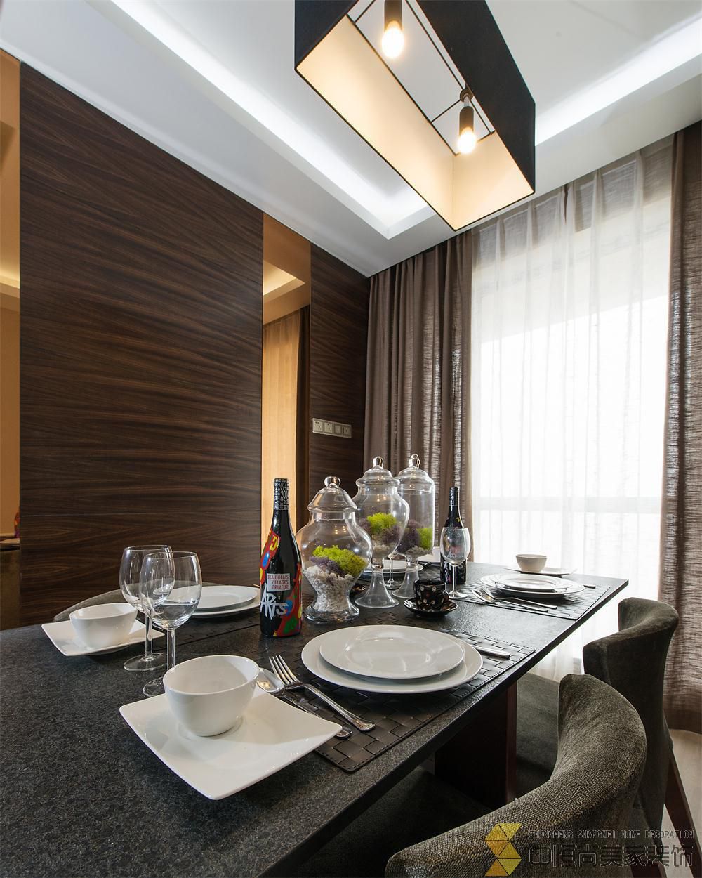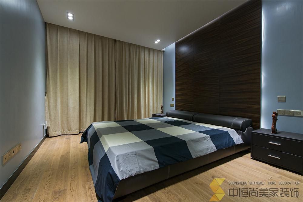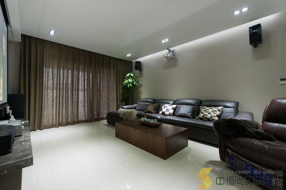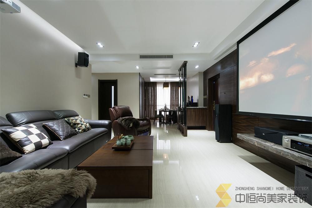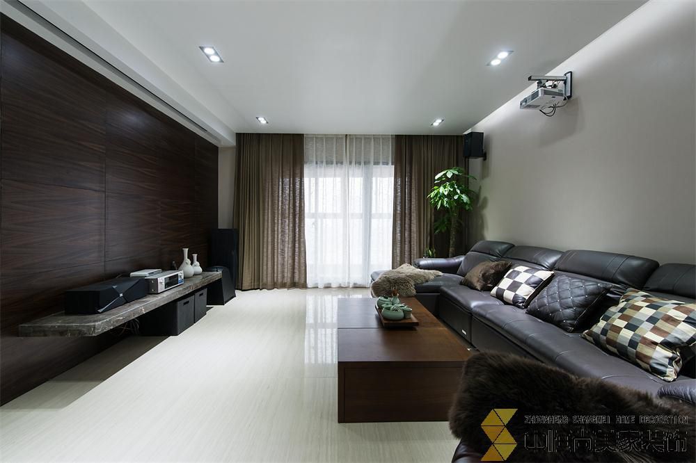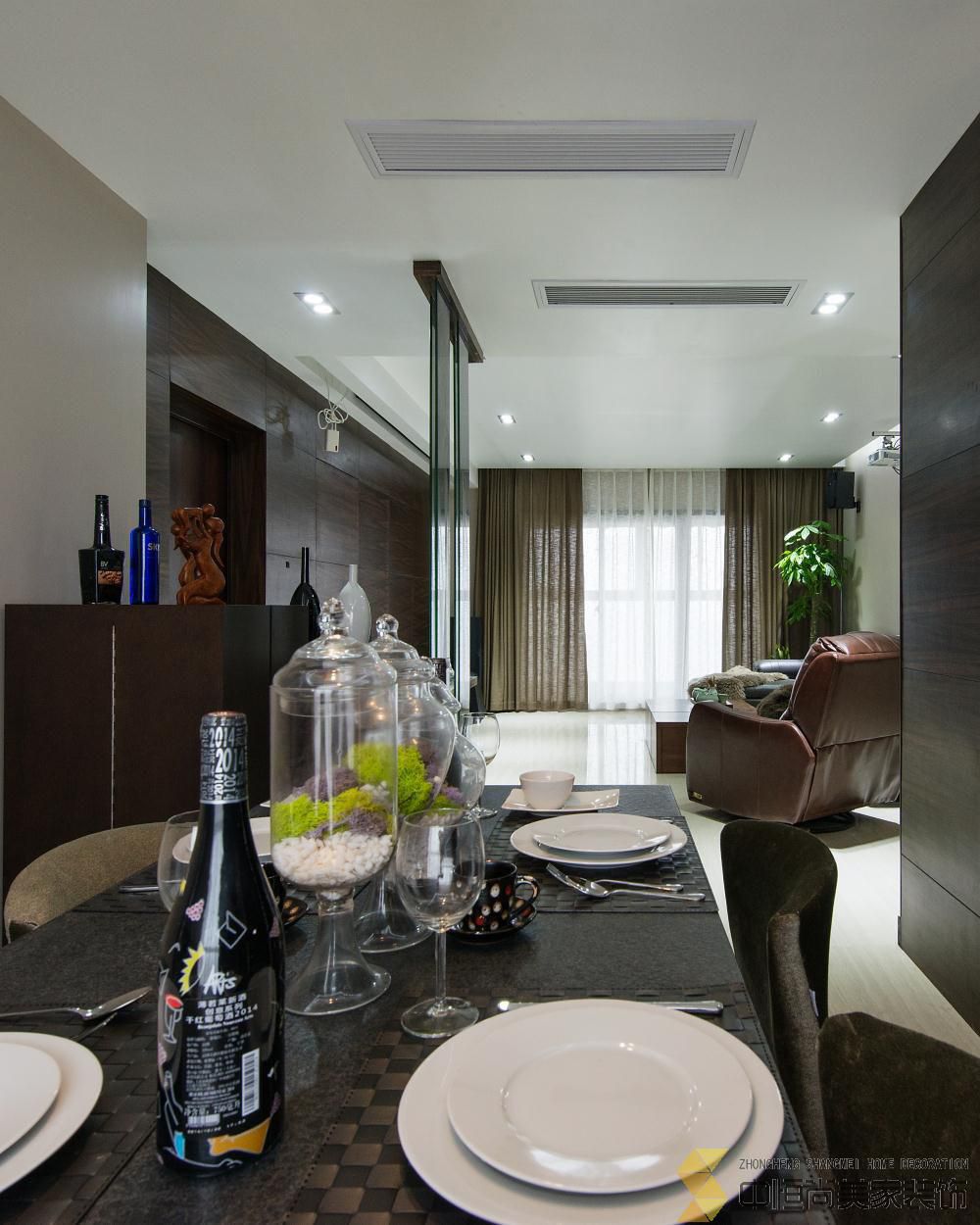 • 本案皆在打造一个简约时尚的现代空间,硬装上没有做过多的装饰,一整面木饰面墙有效的隐藏了一个房间的房门,没有主灯的吊顶简单大气,进门玄关三块重墨的玻璃既起到玄关的作用又与整个色调完美契合
