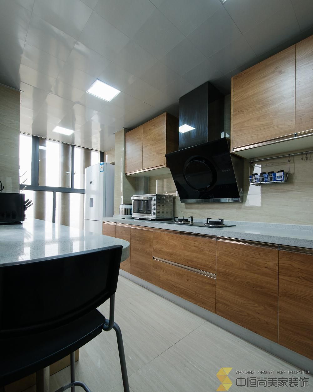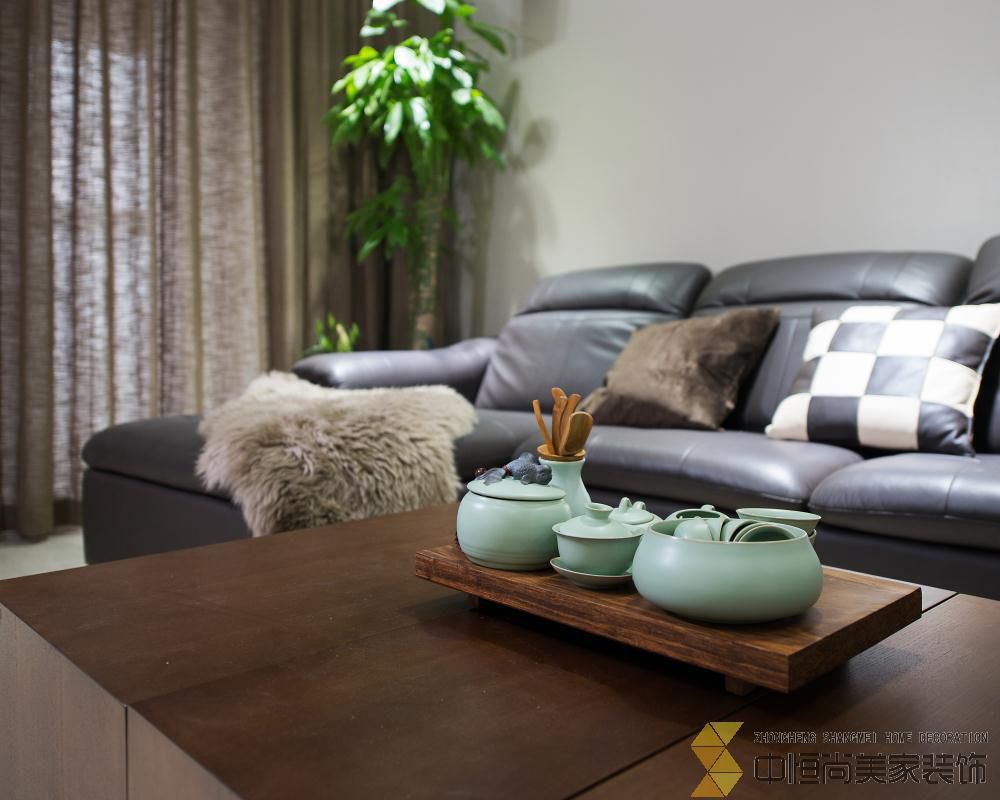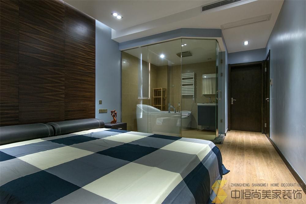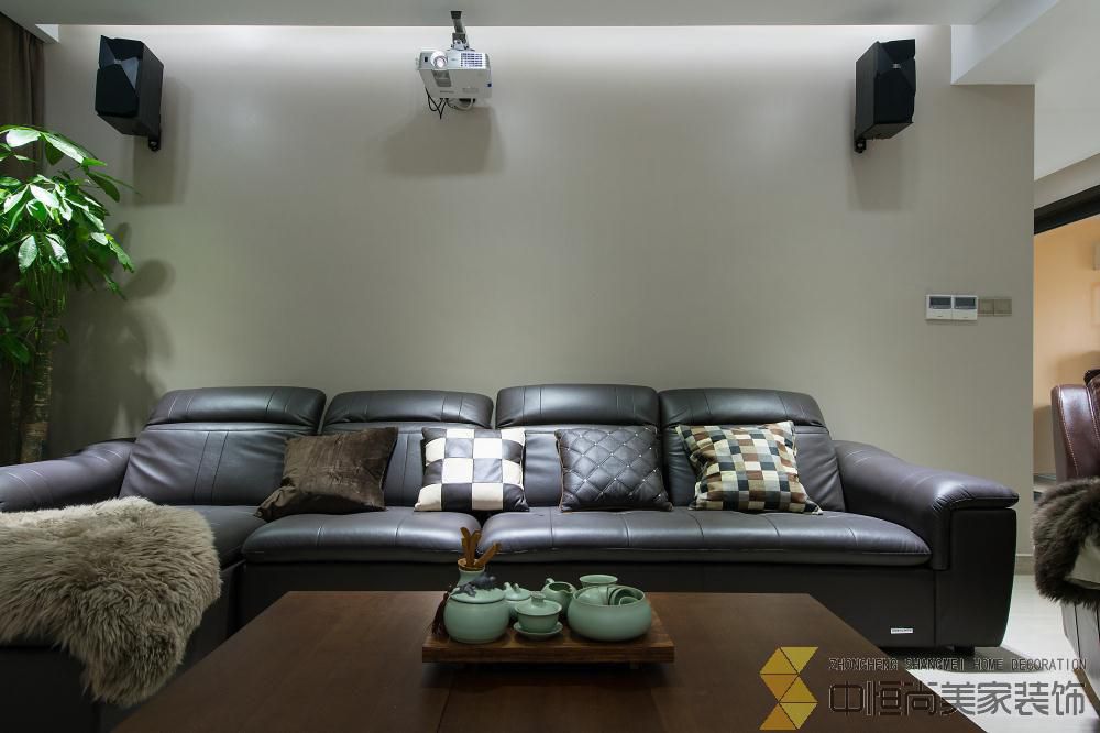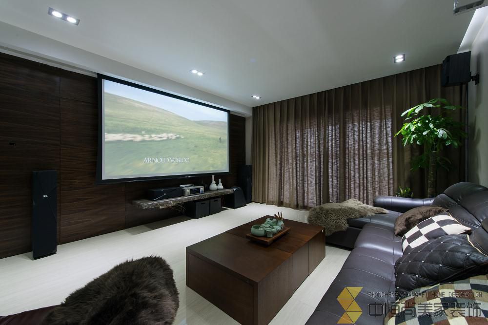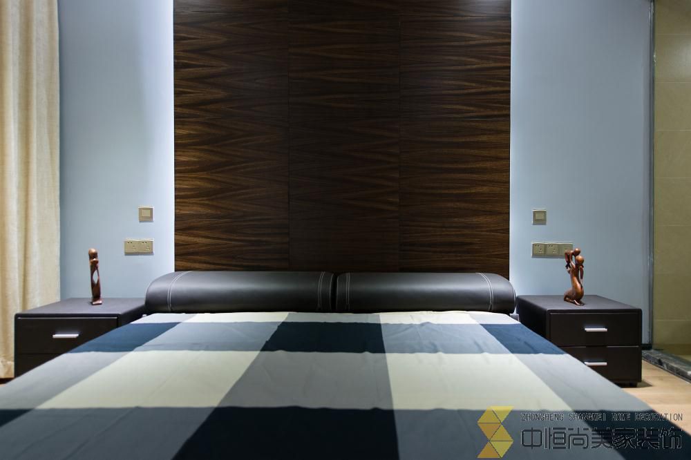 • 本案皆在打造一个简约时尚的现代空间,硬装上没有做过多的装饰,一整面木饰面墙有效的隐藏了一个房间的房门,没有主灯的吊顶简单大气,进门玄关三块重墨的玻璃既起到玄关的作用又与整个色调完美契合