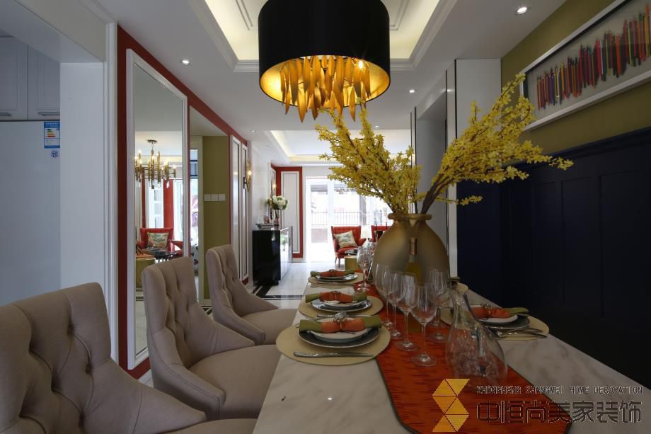 • 该项目的设计是现代、奢华、大气的家居空间风格,实现了现代新古典风。 色彩组合给人以细腻感,色彩的层次和装饰细节的层次都会凸显家的优雅韵味。橘色、黄色、绿色交错的主色调,加上白色的糅合,使空间明亮、大方,给人以开放、热情之感,让人毫无紧张局促感。 从玄关到其他房间,所有的设计都是独具一格,不同的区域采用不同的生活理念打造不同的生活空间。卧室用色温婉,线条简单,静谧的休息环境更能使人心境安宁;客厅红橘黄主色调使空间热闹起来;餐桌的橘色桌旗、透明的红酒杯以及黄色花饰的摆设把餐厅装点得格外优雅浪漫;白色是永不退潮的时尚,白色系列将卫浴间显得明亮宽敞。简化的古典水晶灯饰令房间充满古典的韵味,但又不会因吊灯的过于繁琐而导致整体臃肿乏味。 从结构到选材,再到色彩,设计师都是用心将每一个空间考虑周全,使其呼应空间氛围感及和谐性,表达出家居生活的现代奢华设计理念。