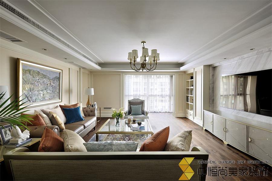 • 客厅以素雅的色彩为肌理,配合金属饰边的家具及摆件,简洁而利落地诠释了现代美式的奢雅魅力。 与此同时,淡蓝色的沙发带来古典特有的浪漫,茶几上的花艺和沙发后的植物,为空间增添灵动的自然气息,在这个看似不张扬的空间里,却有着丰富的节奏递进。