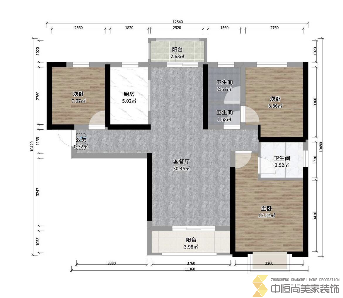• 设计说明: 原建筑户型结构的优点在于南北通透,采光极佳,平面方案对客厅区域做了优化,打通休闲阳台和客厅,客厅区域更加宽敞。