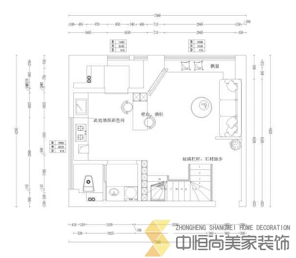 • 房子的结构属于两室一厅两卫的结构,餐厅和客厅属于一个相通的空间,设计的时候充分利用客餐厅区域,将原墙面新砌出一个斜面的电视背景墙,做了吧台和酒柜,解决了就餐和储物的问题。二楼搭建了一个大的开放卧室书房以及衣帽间一体。
