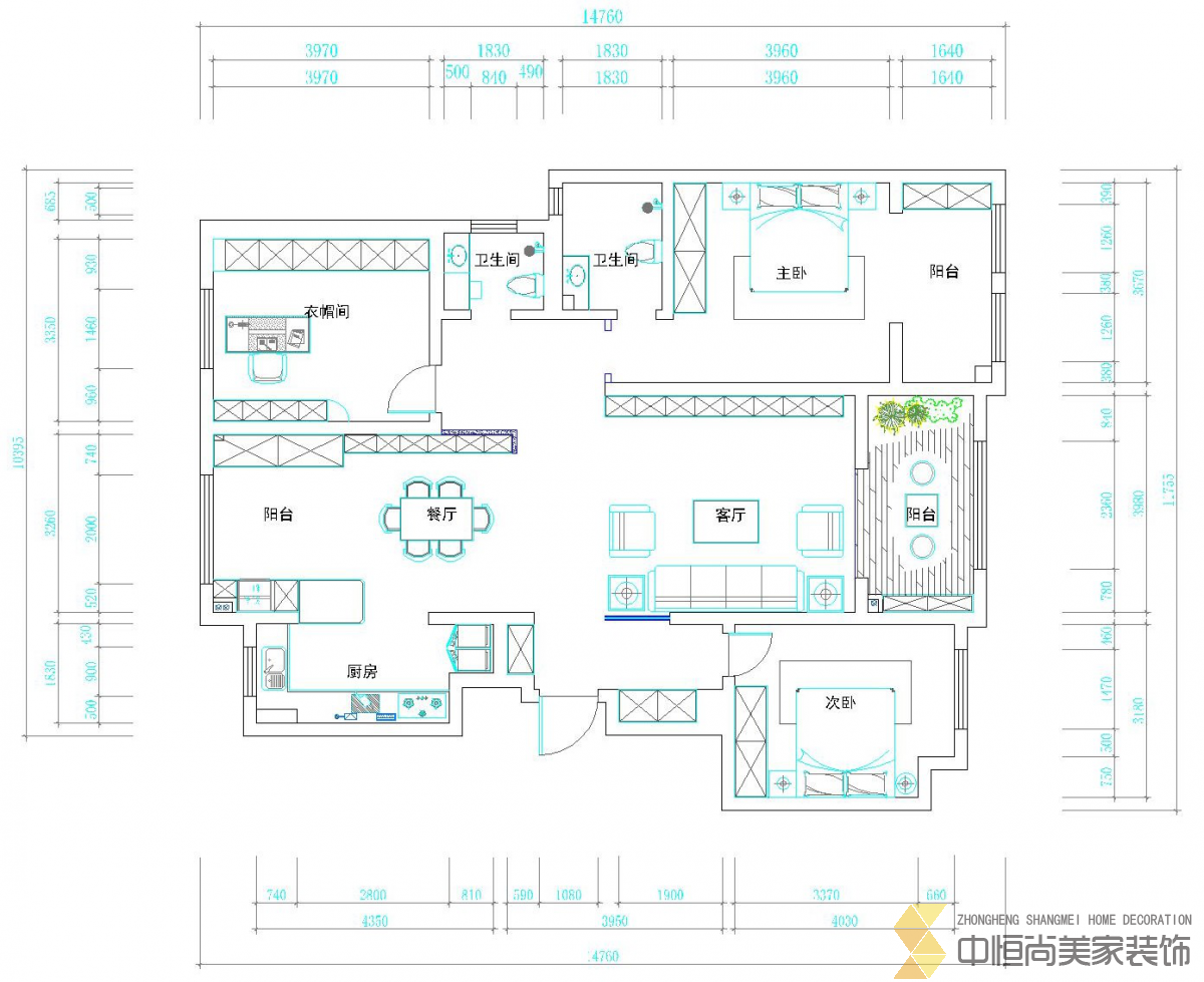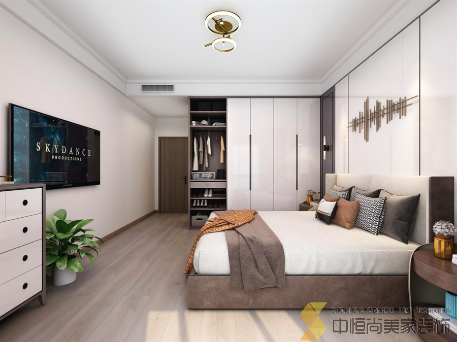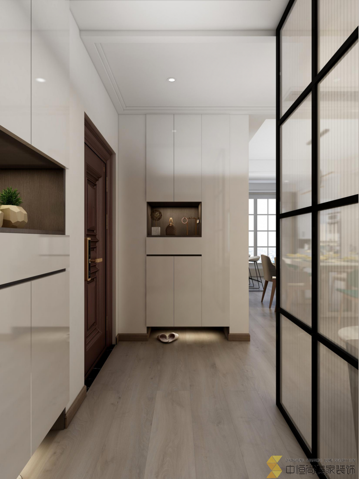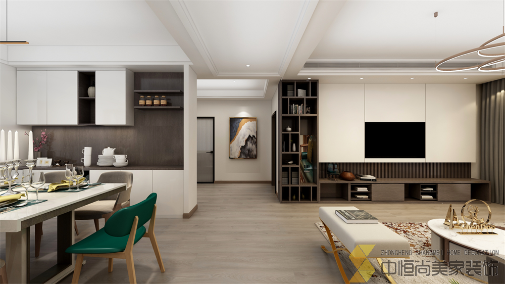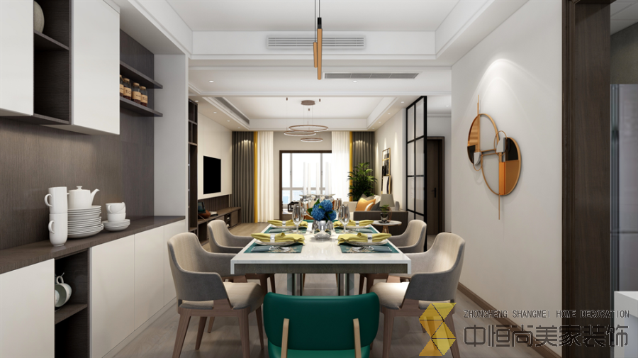 • 平面方案对餐厅区域做了优化,打通生活阳台和餐厅,厨房做半开放式,餐厅区域更加宽敞。客厅阳台采光极佳,窗台比较低,刚好和窗台齐平做地台,有落地窗的效果,在地台设置茶海,喝茶聊天很惬意。沙发墙背后是业主夫妻两人的卧室,主卧让给老人住,次卧门口的走廊比较长比较压抑,所以拆掉了一部分墙体做成玻璃隔断,增加通透性,走廊也更加明亮。电视墙以及餐厅墙全部设置了通顶柜,增加收纳空间,业主的收纳需求比较大。