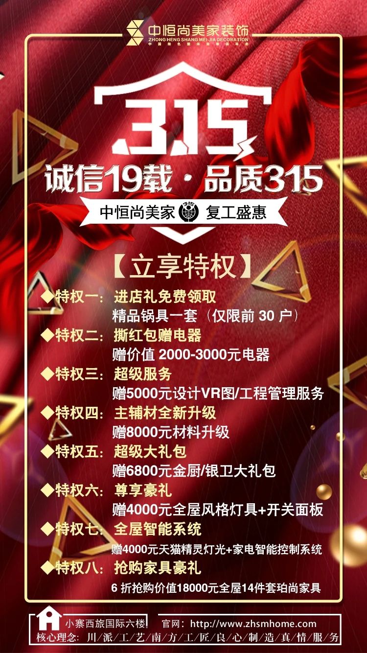 中恒特别推出了本次315品质家装活动,据时将对装修进行全方位的讲解,更有多重惊喜等君临!
