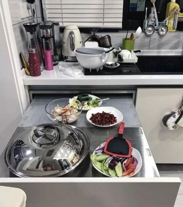 只占一个抽屉的空间,但长久来看,性价比还是很高的。隐藏式台面想做多大都可以,甚至当餐桌都没问题。