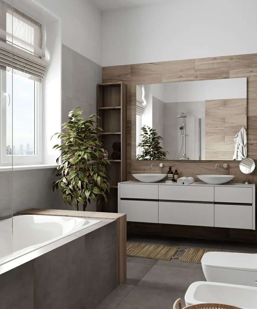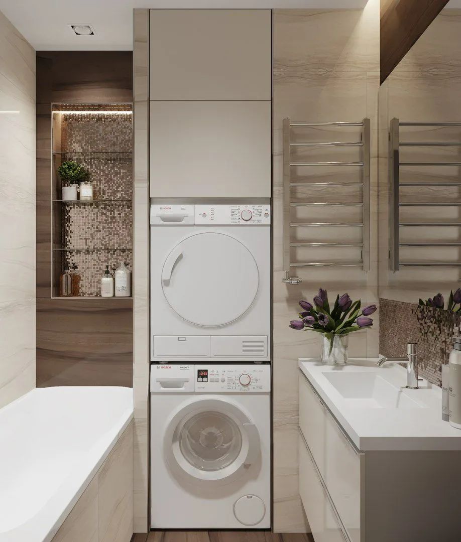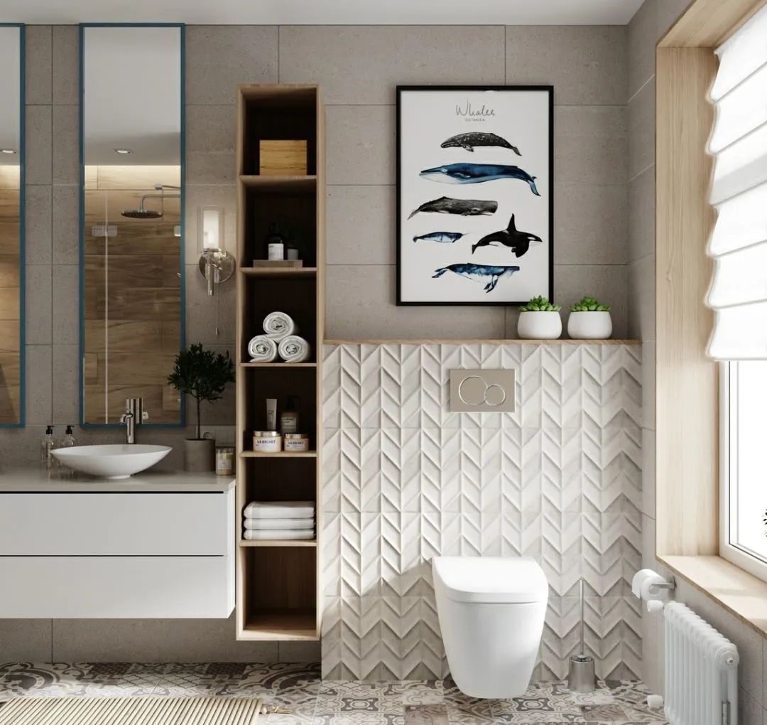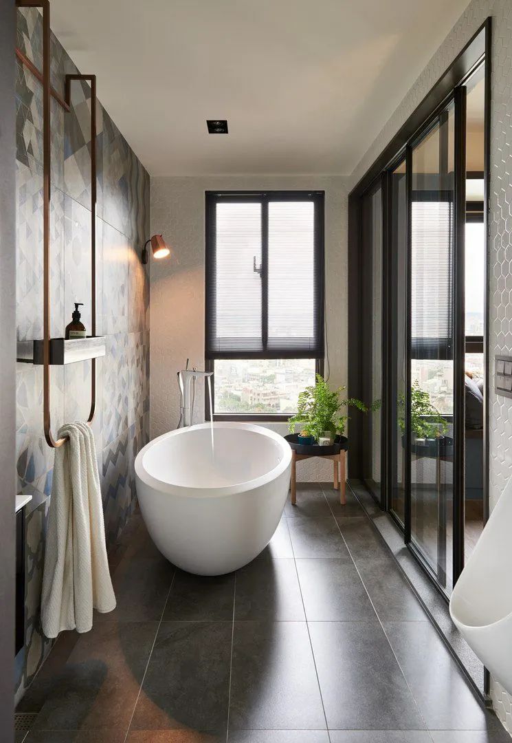 如果你不是白色的粉丝,可以通过温暖的米色,柔和的灰色甚至粉色系(粉蓝、粉红等)来营造空间的宽阔感。选择一款品位高雅的瓷砖,其余的墙面选取与之搭调的色系。整体效果宁静而温馨,不会造成视觉破裂而缩小你的空间感觉。