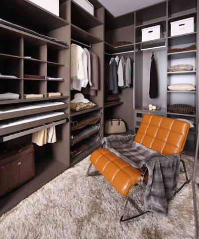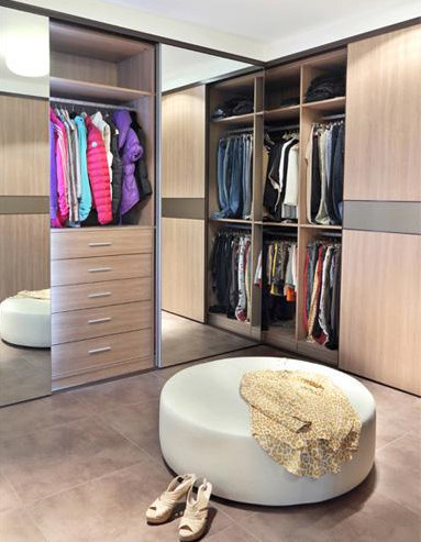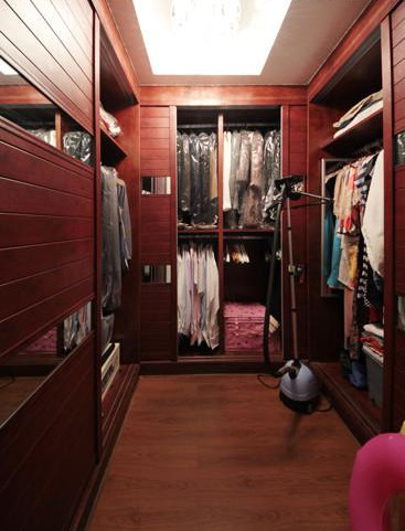衣柜内部实现换季比较适合大空间、整体式衣帽间等。其间内部空间大,容纳丰富,略高于人身高的部分便是换季收纳空间点,将换季下来的衣物收纳于顶端。而不同宽度、多隔层的设计,能将换季收纳发挥极致。